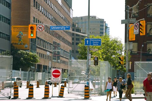 前幾天趁G20戒嚴區的鐵網己装好卻又未封瑣前,到現場走了一趟,順便拍些照片。表面看似寧靜,卻讓人有種山雨欲來的感覺。不要説街上突然多了許多警察。戒嚴區的外圍地帶,各式擺放報纸的鐡箱及郵筒,都被搬遷一空,連垃圾筒也不能倖免,只在燈柱上用膠布貼上大膠袋,供作收集垃圾用,避免受到示威群眾的破壞。同樣多倫多公車局也把候車亭拆遷,只留下兩根柱子,作定位用。