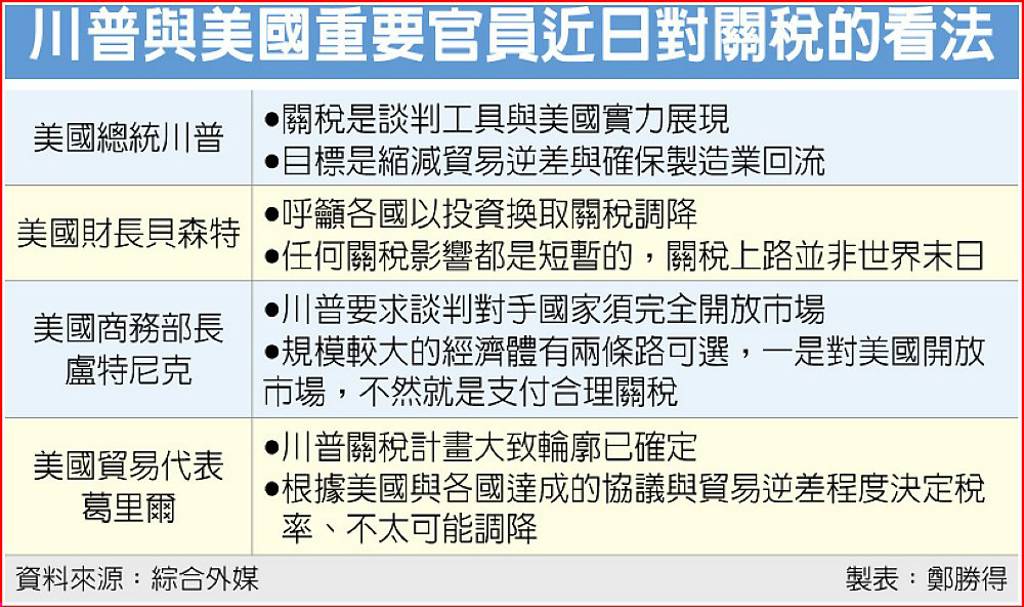 行政院進一步指出,美國貿易代表葛里爾在1日接受福斯商業新聞專訪時也表示,「未來可能還會有一些新的關稅協議,將視川普決定而定」,顯示美方雖基調強硬,仍保留有限彈性空間。