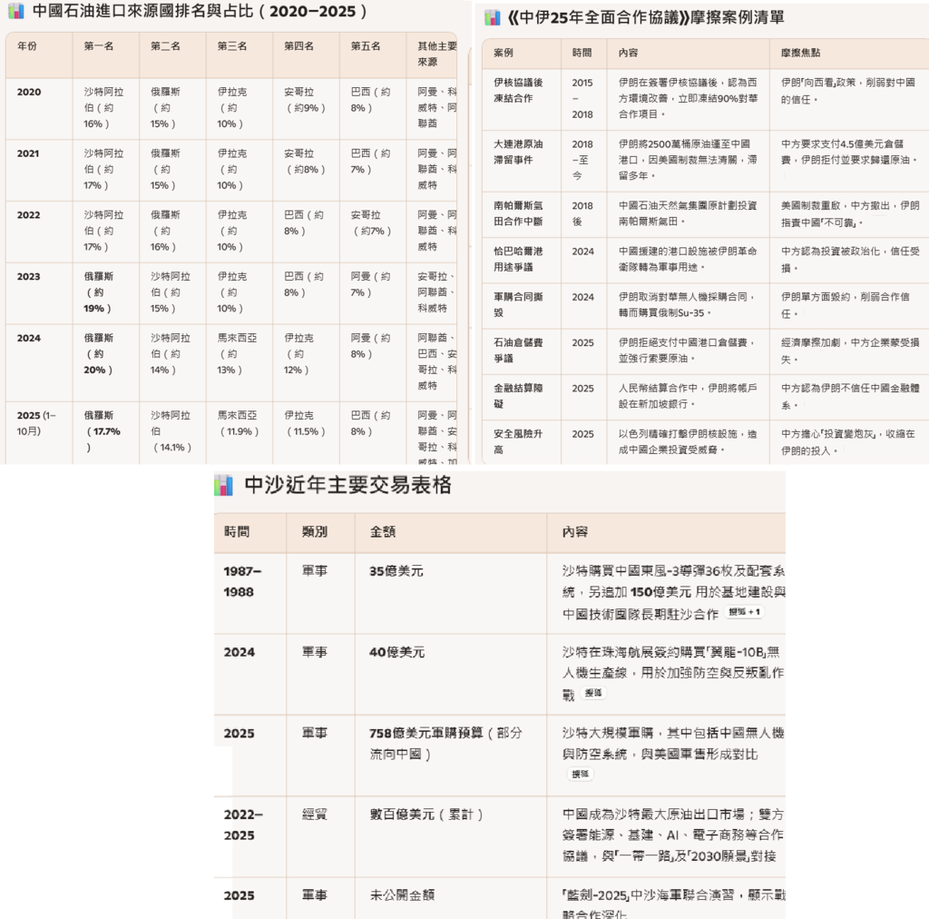 我用AI整理了一份中國石油進口來源國排名與占比的表格(2020–2025),其中顯示,在中國的石油來源佈局中,最近被認為可能崩潰地伊朗、以及前幾天被美國洗劫石油的委內瑞拉,根本不佔大頭,或者說根本排不上號。