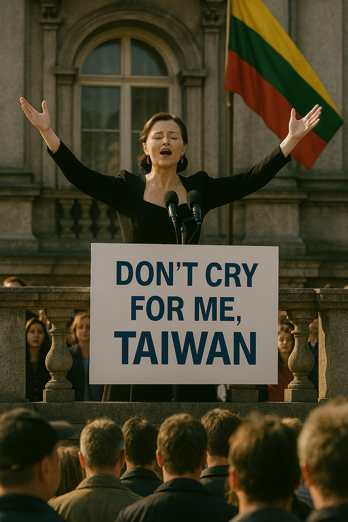 立陶宛當初並不是愛台灣。率先採取行動並讓台灣設置「駐立陶宛台灣代表處」,只為獲得全世界的肯定,但世界卻沒有給與肯定,沒有人稱讚。立陶宛自遇見台灣以來,常願天下的蘭姆酒,都能夠以天價賣給呆胞;然而台灣遍地狼藉,滿街青鳥亂竄,要想無限暢飲,卻是沒有胃口!日頭赤炎炎,性命自顧。立陶宛也只能面向東方而跪大國啦!