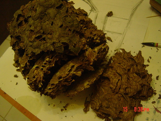 為了想把掉落的蜂巢做長期保留, 就把籃球大的窩巢裝在大盆子裏放在院子曝曬,下了幾天的雨也忘了收回來,今天要用盆子才想到去收, 我的天啊 ! 盆裏的窩巢已經完全化成一盆骯髒的糞水,那個味道比我在天山被駱駝噴了一身的口水還要臭上好幾倍,上網查看有關虎頭蜂的資料, 才知道原來窩巢的組成是樹皮枯葉,及蜂的分泌物,大概是泡在水裏太久,腐化分解才會那麼臭,大自然生物的奧秘真是了不起,小小的蜂竟能用樹皮枯葉築成有花紋的巢,平時日晒雨淋都不怕,一旦成了空巢竟變得如此脆弱泡幾天的水就化成泥了,難到連窩巢都有生命 ?