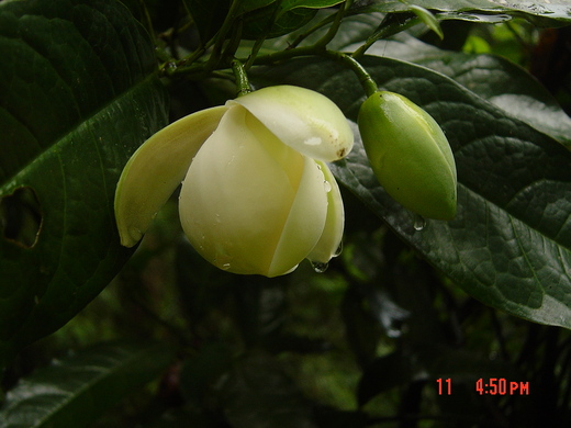 夜合是我最喜愛的花之一,綠白分明,永遠給人看到的都是含苞待放的樣子,即使是要凋謝也是偷偷的在夜晚凋落,花前聞不到花香,卻總是在傍晚飄出悠悠的香氣,有一首客家詩形容夜合花 : 客家人視它為貞潔的象徵, 客家婦女白天勤做家事,夜晚給老公聞陣陣的體香,河洛人則不愛夜合,把它當成夜晚勾引男人的鬼魂花。連花都有白綠之分也未免太政治了些吧 !