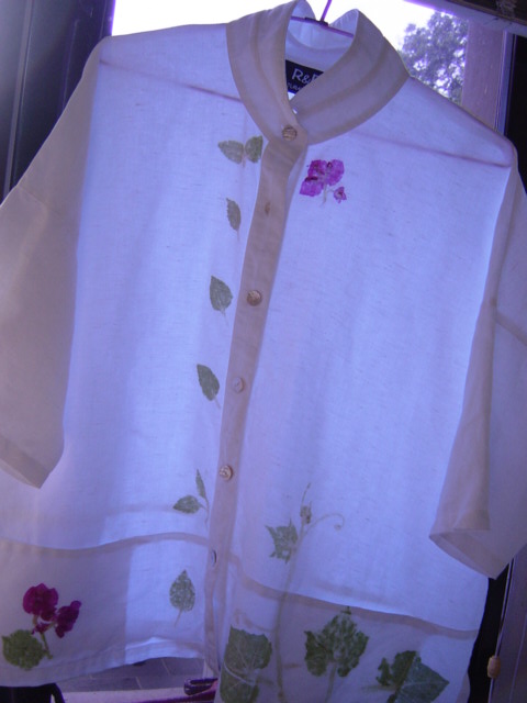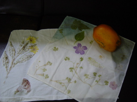 拓染的第一步就是樣品試做,把家裏所有的白色衣物找出來,拿一件不穿的T-Shirt剪成四方塊,石球及橡膠槌子有現成的,院子裏可以玩的花草太多了,有黃色的絲瓜花,紅色的鳳仙,成串的紫藤,粉紫的幸運草...隨手摘了幾種,就拿著書照老師在會場教的方法敲敲滾滾的做起來,拓上去的顏色還真美,桌子不平不好敲滾,坐在地上最適合,就這樣從早到晚,樣品做完了就正式玩真的,棉的麻的絲的衣服,褲子,圍巾,從便宜的到貴的,只要是白的全都上色了,還很得意的掛起來展示,拍照留念。