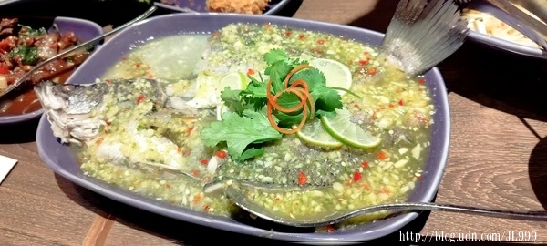 【檸檬魚】清蒸鱸魚的泰式料理基本款。鮮甜魚肉透著檸檬香氣與蒜香味且微辣,好吃得沒話說!