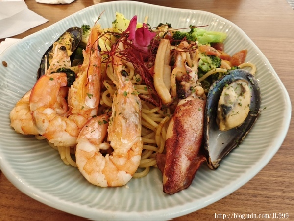 ↑主餐【剝皮椒香海鮮圓直麵】*2 ($698) 食材新鮮,簡單調配義式迷迭香料,鹹度味道很到位,剛好不過火,吃得到滿滿的鮮嫩白蝦、小捲、淡菜所釋放出的海味,融和入整體的蔬菜及麵條而轉換甜味。好吃!