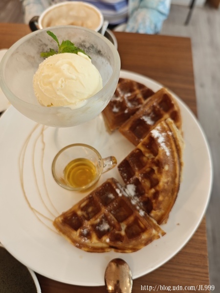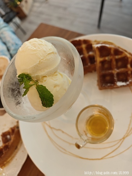 烤熱的鬆餅,外酥內軟,淋上焦糖。兩球香草冰淇淋,一人一球。搭配著附送的蜂蜜一杯沾著吃。啊~真是極品完美甜點。