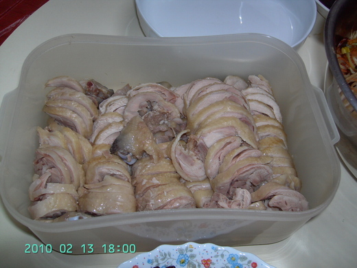 每到過年我們一家都會聚集團圓,吃個年夜飯,這一餐幾乎都是三姐下廚所做,但今年我和小弟各做了一盤菜,我買了六隻去骨的雞腿,每隻用一瓢鹽抹在皮和肉上,然後捲成肉捲後,放入冰箱冷藏兩天,讓鹽入味。到了除夕的早上,放在電鍋內蒸熟後,等冷卻再放入冰箱,使肉定型成捲狀,等到下午三點,再拿出來切片,就成了一盤小朋友最愛的鹹水雞。晚上幾乎被他們吃光了,真的非常高興,其實這是三姐教我的,非常的簡單。