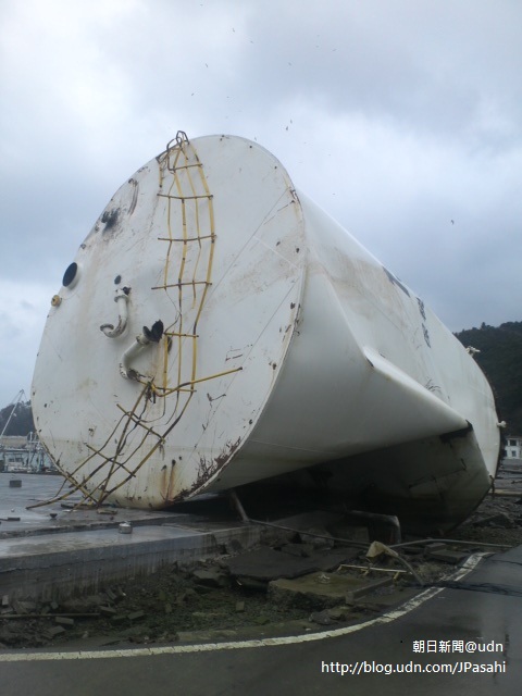 曾經在女川港努力運轉著的大型儲水塔,默默地躺在那裡,彷彿在訴說著此次海嘯的威力。