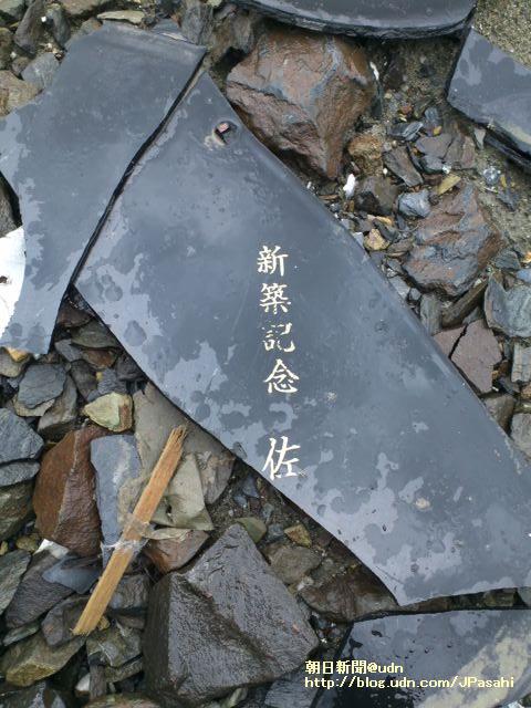 在災區的房屋被連根拔起,地面散落了各式各樣的東西。「新築紀念(譯註:新居落成)」,我找到了刻著這句話的房屋碎片,讓人不禁想起過去幸福的生活。