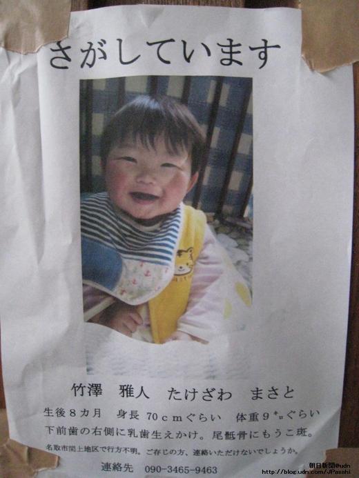 這是在名取地區四處張貼的嬰兒照片,照片中的孩子似乎才八個月大。「孩子你在哪裡?如果你已經到了另外一個世界去,也至少讓爸爸、媽媽見你最後一面吧!」從照片中傳來雙親的悲戚思緒。