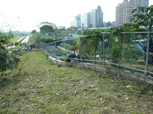 (一)可惜一大片地方被闢為私人菜園,沒有加以整合。【建議】將菜園稍作規劃, 私人菜園續保留成一塊一塊以圍籬圍起來,但每一大塊菜園四周加闢一人行道,當做可觀賞菜園,園主未有損失,而市民也可以有更寬闊、美好空間的河濱公園。