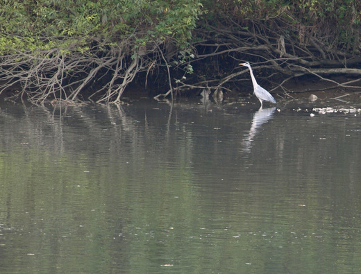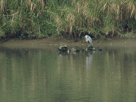 今天發現對岸岸邊因有部份沼澤濕地,有些聰明的水鳥就站在岸邊等待溪水裡的魚兒,魚兒不小心游靠近牠可能就成了牠的佳餚。在這裡可以賞鳥,目前眼睛能看清的,除了靠近人類的鴿子、麻雀外,有白鷺鷥、蒼鷺、夜鷺,其他的不是看不清楚就是不認識的鳥類,可惜未備望遠鏡。溪裡的魚兒不時會彈跳水面上,想必一樣也是發現了食物 - 蚊蟲類吧!