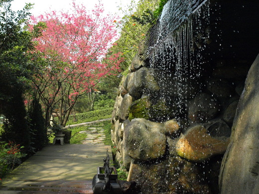 義工常住講師還告訴我們站在一樓參拜大廳中去欣賞地板上的「湖光倒影」- 明亮的窗外景色映照在光亮的地板上,室外櫻花、瀑布、樹木...,就像一幅畫,可惜大廳內不許照相。