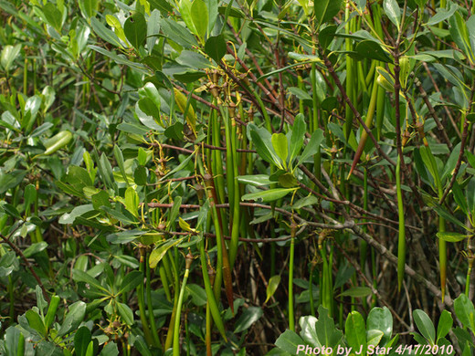 水筆仔真像一枝筆掛在樹梢上。 結實纍纍的水筆仔,靠此傳宗接代