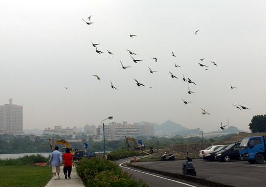 週末的天空一幅即將下雨的樣子,永和市區狹小缺乏大片綠地公園,中正橋河濱公園仍然是居住附近永和市民的唯一可去散散步的地方。這裡有一群鴿子在草地上,人一靠近就飛起來,成了最具動態的主角。