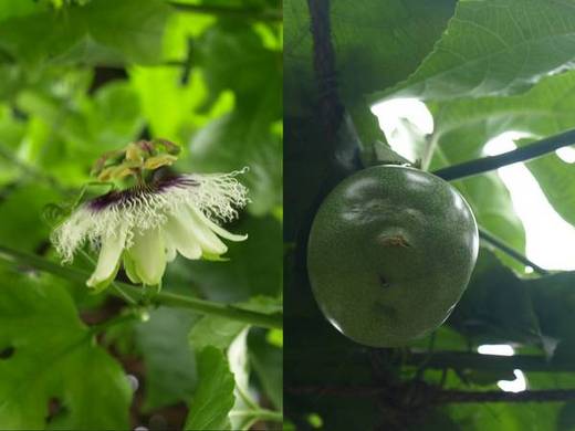 看下圖右邊的百香果,是不是像一個臉譜? 原來這裡的果樹是不灑任何殺蟲劑 (因為市民在這裡活動,管理員的愛心),所以百香果被果蟲叮咬就成了這個樣子。大一點的芒果用紙袋套起來,就是怕果蟲來咬。小芒果太酸,果蟲沒興趣,所以還可安全成長。