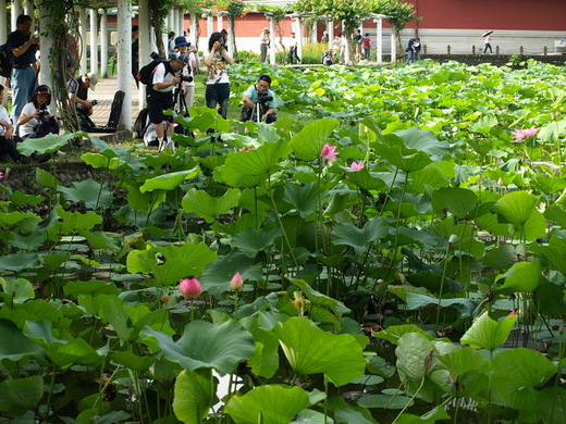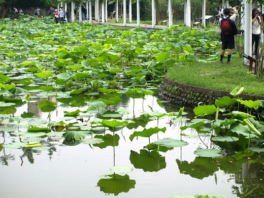 台北市可以賞荷花的地方,目前我只認識植物園與士林至德園這2個好地方(平常太少自己出門了)。植物園的荷花池不小,目前尚未到荷花盛開期,但是陸續綻放的花朵,已足夠吸引攝影愛好者。攝影攜帶的配備,有壯觀配備,也有攜帶小而巧配備者,都是愛荷者或攝影高手。