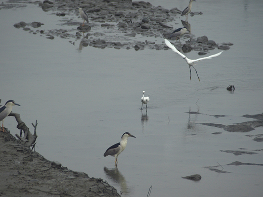 河濱公園左側,各種鳥類棲息守株待兔等水中小魚,或水邊沼澤地的蚯蚓、生物。夜鷺、白鷺鷥最多。白色的鳥就稱它白鷺鷥,因實在也分不出,只看道有的鳥啄是黑色,有的頭部和嘴部是橘色。牠們不像夜鷺穩重,只要走動靠近些就飛起來。