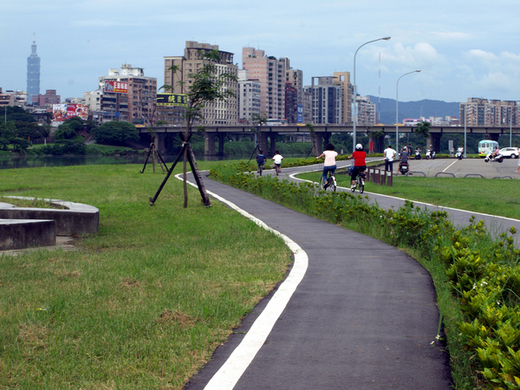 假日親友、親子遊騎自行車,在這裡到處可見。橋下有一自行車出租處,假日花25元/一小時就可租一輛淑女車,沿著堤岸自行車道騎乘,飽覽水岸風光,又健身! .... 那一天應該也騎看看,應該可以直達華江橋去二重疏洪道賞花咧 .....不知要騎多久?