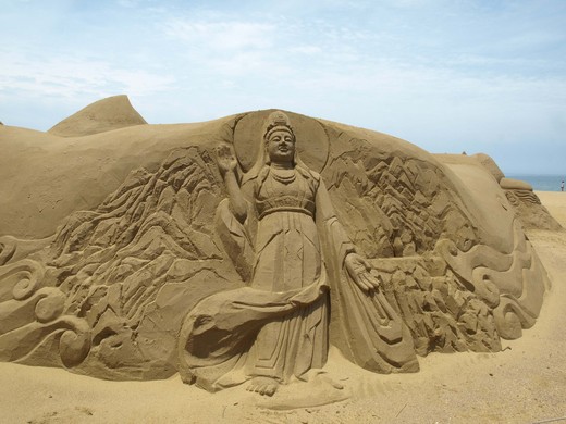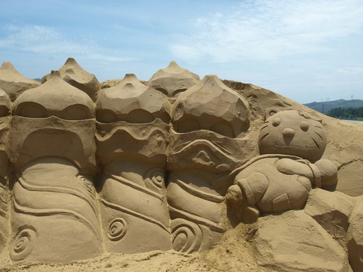 「最近常下大雨,福隆海水浴場的沙雕會不會被雨水沖壞啦?...」這是去之前朋友的疑問;有人說: 「不用擔心! 會噴一層防水膠,不怕雨水!」......... 不過,作品還是有小部份沙崩缺一小塊現象,應該是雨水的關係吧!