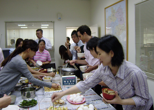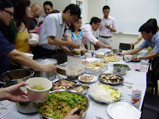 公司行號當然也不免俗,準備Pon Pai 祭品祭拜好兄弟,也希望大家平安順利。地基主也要祭拜一下,感謝囉 ! (說實話,這些習俗我還是不太清楚!) 第二天祭品已被能幹的同事變成了一桌Pon Pai 的佳餚! 一起共享換祭五臟廟啦!.... 真有家的感覺!