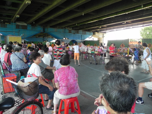 週末中正橋下民眾各攜供品到橋墩下一起拜拜,舉行超渡法會,立委林德福還到場致詞。這裡已禁燒紙錢,節碳減污染囉 ! ㄚ桑們趁機會聊聊天聯絡感情。