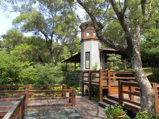 四月桐花開滿樹,現在看到油桐籽也是結滿樹! 淡雅的建築庭園,讓人心曠神怡。往右手邊木板梯道上去,夏天!還是有值得欣賞的花花草草。
