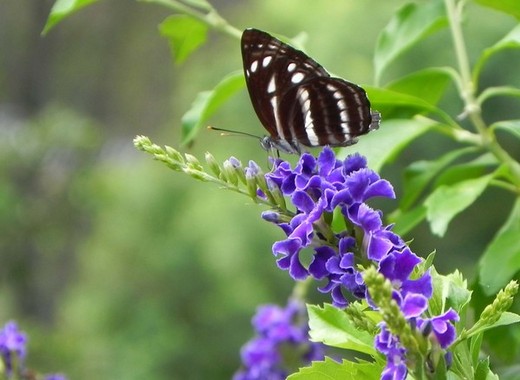 夏蟬知了躲藏樹上「知知知~~~」,不曉得它到底知多少?只留空殼現身樹幹枝葉上!紫藤花在棚架上燦爛的紫盡情綻放,一點也不畏天熱。布袋蓮在小水盆中開著淡紫討喜的色彩,小時候媽媽喜歡種花花草草,他讓我認識蝦尾花,在這裡勾起了小時的回憶.......三線蝶停在金露花上,以前不太明白,明明紫色的花朵,為何要叫金露花?看到金黃色的果實才明白!這裡也是鳥兒的天堂,到處可看到鳥巣,尤其是西印度櫻桃樹上,或許是枝葉茂密,又有果子可以吃吧!不過鳥巢已鳥去巣空,小鳥已長大了!