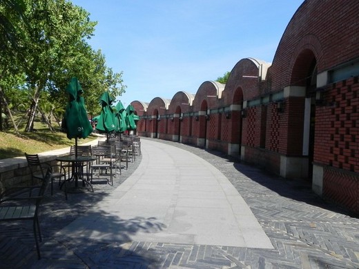 一進去就看到「目仔窯」商店街,此為仿日據時代傳入台灣的目仔窯造型建造,長長身驅由許多窯身組成,側開一目一目的窯口(孔),故而名之。