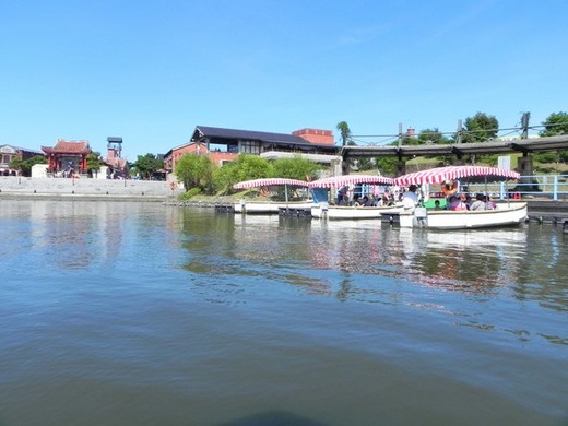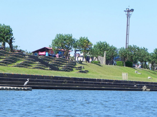 一趟船行約15分鐘就抵親水公園,小船航行中可見廟宇沿岸建蓋,近親水公園時,看見一孤獨蒼鷺在岸邊覓食。