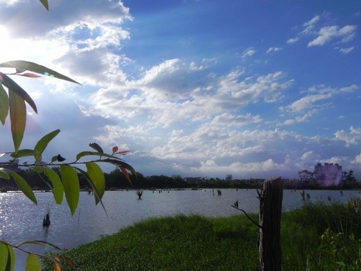 沿著環湖木棧步道行走, 園中有許多木雕藝術品, 湖光倒影, 景色宜人!在傳藝中心白雲白的像一球球的棉花糖掛天空, 而這裡 - 掉到地上的棉花糖在空中, 姪女說. 樹梢上休息中的蜻蜓,告訴我們這裡有它的食物鏈與適合的生活環境, 當然也就是應該有不少蚊蟲吧!