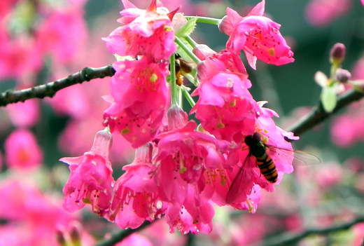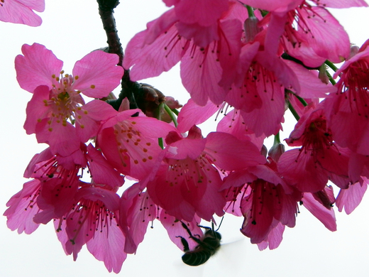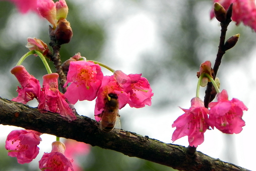 櫻花的芳香對蜜蜂真是致命的吸引力,不畏鳥兒可能的襲擊,也要吸食櫻花的花蜜。