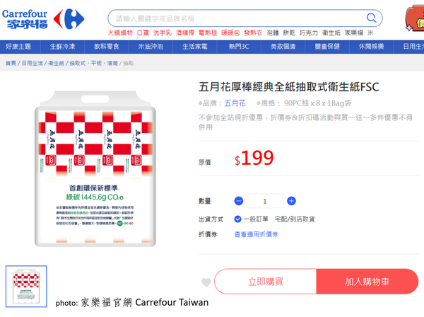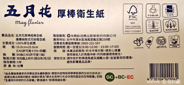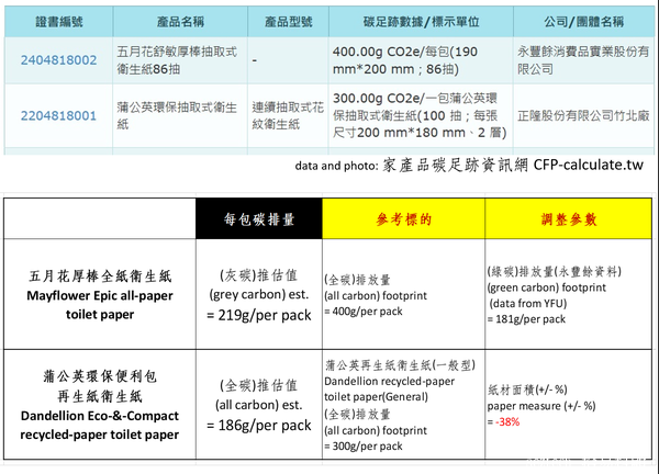 關於這兩個環保永續產品佳作的製程碳排放,由於兩個產品的紙張規格、厚度、張數都不同,也都沒有申請碳標籤的認證,並沒有客觀的基礎來比較,只能推估五月花厚棒全紙衛生紙的灰碳(全碳足跡減去森林碳匯的綠碳)排放量是每包219g;蒲公英環保便利包的全碳排放量是每包186g,謹供讀者酌予參考。