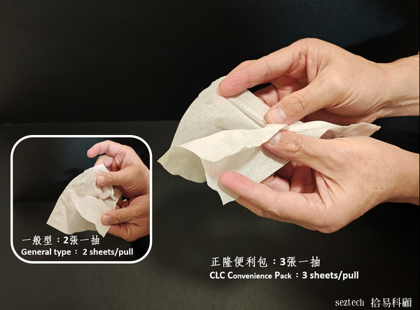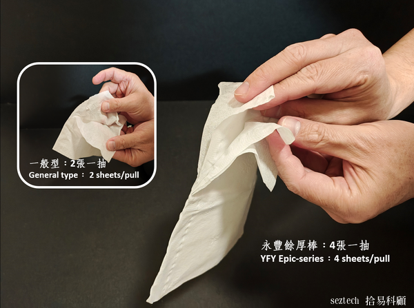 這是4張一抽的厚紙系列,與一般2張一抽的衛生紙簡單換算,約等同180抽8包的價格不到200元,僅是略高於普通衛生紙,已經具備適當的勸敗說服力。紙質舒服柔軟,但是4張一抽的規格浪費,顯然與環保減廢的原則有牴觸。據永豐餘服務解說人員的解釋,4張一抽的規格是適用在女性消費者的卸妝使用。個人認為,與其它的厚棒系列衛生紙相同,都是高價位產品為追求差異化讓消費者分散對於產品性價比的關注所採用的設定。由2022年底,厚棒系列原生紙漿衛生紙在統一集團(家樂福母公司)旗下的7-11、聖德科斯通路特價促銷、或作為會員消費滿額品的大規模促銷來看,這個4張一抽規格的市場接受度,可見端倪。