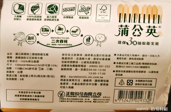 接下來要介紹的是一項已經有年紀的長壽但不怎麼暢銷的產品 – 正隆紙業的「蒲公英環保便利包衛生紙」。蒲公英環保衛生紙系列,從2009年就已經上市銷售,使用100%再生紙漿,也擁有FSC認證。面對再生紙漿比原生紙漿價格更高、紙質粗糙、以及色澤灰雜的客觀限制,蒲公英環保便利包在全聯社通路販賣,110抽10包一串售價179元,可知每張衛生紙的單價比永豐餘全紙衛生紙更高,也可以視為在價格敏感的日用品消費市場不會紅的主要原因。但這款老而彌堅的產品與永豐餘全紙系列比較:18x13公分的紙張規格(vs 一般型約為20x19公分)要減少38%的紙材用量;3張一抽要比4張一抽的規格符合不浪費原則。另外蒲公英再生紙衛生紙易於水中裂解,所以能適用於餐桌、客臥室、以及如廁使用,讓這個環保便利包衛生紙擁有極佳的產品便利性能。即使再生紙質的觸感不佳(仍在大部分使用者可接受的範圍內),但對於環保的正面貢獻更佳,所以這個正隆蒲公英老產品的評鑑評分要高於永豐餘五月花全紙衛生紙。