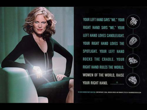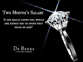 舉日本為例 , 日本人原來沒有將鑽戒當成訂婚或結婚信物的風俗。但是在二次大戰後的二、三十年間 , De Beers 的廣告策略改變了日本人的文化。短短地二十幾年間 , 超過 60% 的日本人開始將鑽石當成結婚誓約的交換憑證 , 直到今日這已成了全國性的風俗。