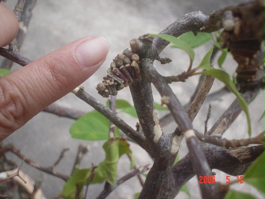 整理花園時,無意中發現在九重葛小樹中有個小小的突出物,就在小枝葉邊緣,剛開始以為是修剪時的叉口,仔細一瞧,是一小小根的樹枝非常有秩序的排列,而且由大而小,旋轉到底。而且只有我食指指甲的大小,好新奇,也好奇是什麼樣昆蟲的家,或者該說是蛹吧,也不對,因為它是用九重葛,裁成大小不一的的樹枝,是小屋子啦!而且有好幾個呢!所以,我拆開了一個來看看是誰住在里面? 不在家,只是有一些像棉絮的東西,而且它黏的很緊,很牢固,像非常精致的手工藝品。