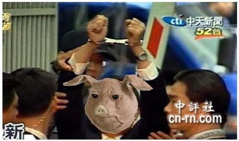 扁扁扁, 扣都扣了, 也成了豬頭, 手還舉高高的做啥 ??