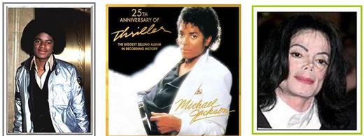 Michael 自 Jackson 5 開始, 那令人疼愛, 最出風頭, 最受人喜愛, 唱的最好的小弟弟一路到 Thriller 時達到無人能檔的超級巔峰 !! 雖然經歷過幾次的整型, 但是, 都尚在可以接受的程度 ... 而接下來離譜到底全身漂白, 亂整一通, 令人難堪的幾段婚姻, 戀童醜聞, 加上胡鬧荒誕的行為, 已經把 "Michael Jackson" 變成是令人嘲諷及笑話的代言詞 ...
