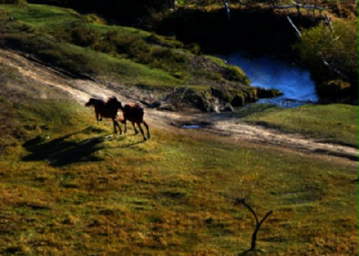末句借自杜甫<房兵曹胡馬>詩,原句為「竹批雙耳峻,風入四蹄輕」,這兒有二匹馬,因此改為八蹄。 龍媒:指駿馬。