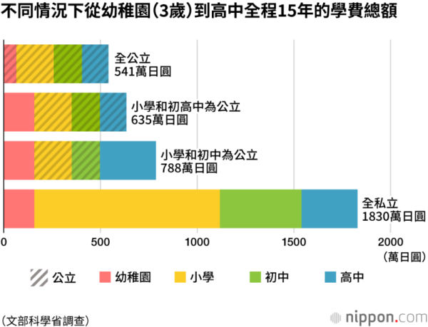 根據日本文部科學省2018年發佈的《兒童學費調查》,日本學生如果從幼稚園到高中都就讀於私立學校的話,15年下來總的教育支出(包括學費、伙食費、交通費、校外學習和輔導班的費用等)達到史上最高的1830萬日圓,是全程就讀公立學校(541萬日圓)的3倍以上。