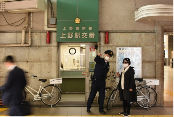 位於東京都台東區,警視廳「上野站派出所」的警察為車站的使用者(右)指引道路=攝於3月18日(大山稜)
