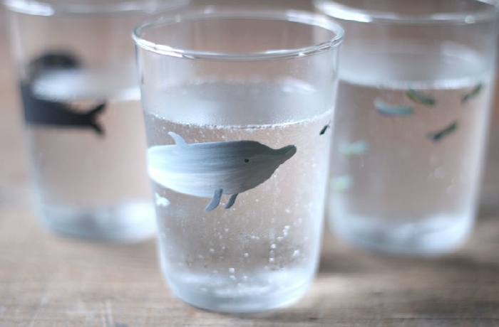 第一眼看到這個水杯,就好想要在大海裡和小海豚一起游泳,非常沁涼的感覺從心湧上來,好像當水倒入杯子的瞬間,你就擁有了整個海洋世界。(這裡還有大鯨魚和大肚魚,如果你想要擁有的是森林世界,這裡還有很多花花草草跟蝴蝶!)