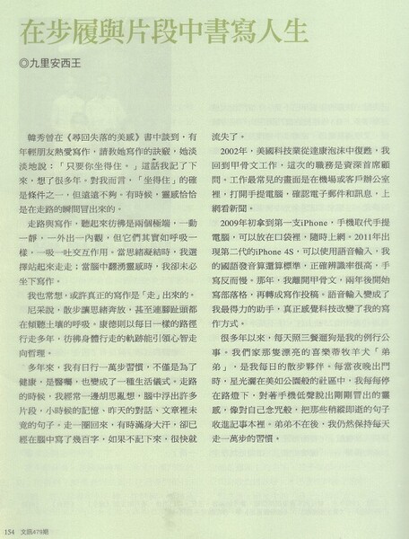 韓秀曾在《尋回失落的美感》書中談到,有年輕朋友熱愛寫作,請教她寫作的訣竅,她淡淡地說:「只要你坐得住。」這話我記了下來,想了很多年。對我而言,「坐得住」的確是條件之一,但遠遠不夠。有時候,靈感恰恰是在走路的瞬間冒出來的。