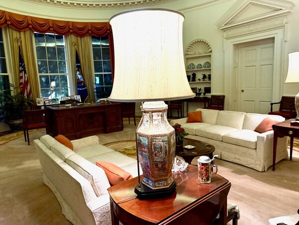 複製的白宮橢圓形辦公室桌上放著一個裝滿多彩軟糖豆的玻璃罐