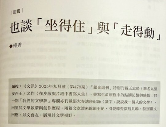 【編按:《文訊》2025年九月號(第479期)「銀光副刊」特別刊載王志榮(筆名九里安西王)之作《在步履與片段中書寫人生〉,書寫生命旅程中的點滴記憶與感悟;同一期「我們的文學夢」專欄亦刊載張大春講座紀錄...
