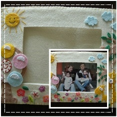 還有喬琪利用不織布做成的多用途框框,這是她自己構圖一針一線裁縫的,爸比和孩子讚不絕口,暖烘烘的太陽、白雲、花朵、摩天輪,這是孩子童年記憶的縮影。