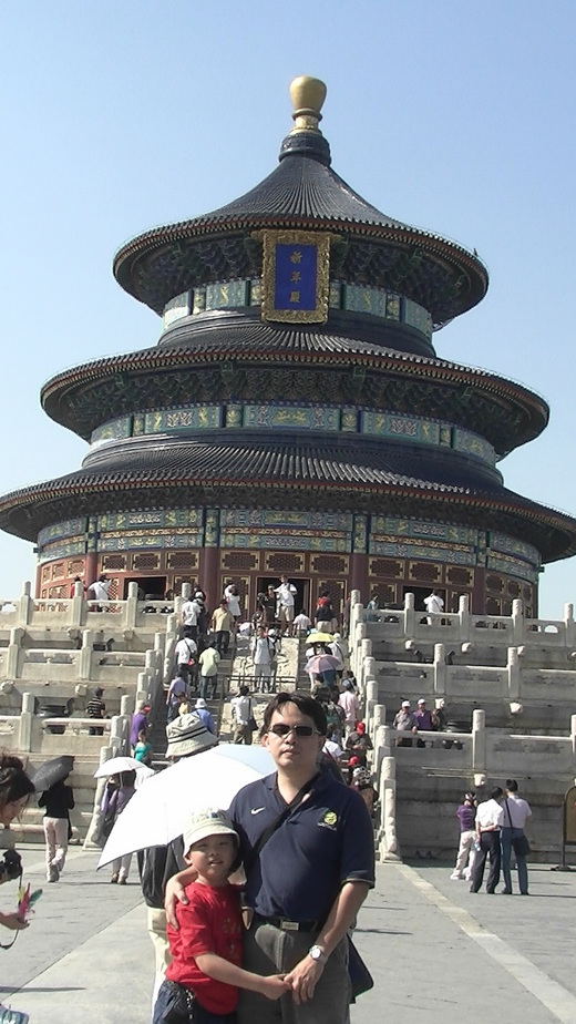 下午坐天津與北京之間的城際列車回北京,速度很快,可以達到每小時四百多公里的速度,我們只花了差不多26分鐘就回到了北京。接著去參觀天壇。天壇是古時候皇帝祭天的地方。我們印象中的天壇是祈年殿,是擺放神主牌的地方,(想當初我們在美國開餐廳的時候,餐廳名稱就叫做北京飯店,父親設計的logo 就是天壇,現在才知道其實那是祈年殿) 。又讓我想起已經過世的父親,可惜沒有機會帶他來看看。