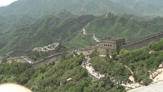 從德勝門出去,車程開了一個多小時。慢慢的,高樓大廈不見了,開始看到果樹以及山丘。突然之間,”火車ㄟ” ,心鵬指著一台直駛而過的列車叫著。導遊告訴我們,下面的鐵路就是詹天佑鋪的中國第一條鐵路,想當年中國積弱不振,但是還是有一批胸懷遠見的人士為國家奉獻自己的心力,救亡圖強,就讓人非常的感動。車子繼續往前開,接著就看到長城蜿蜿蜒蜒的在崇山峻嶺中攀爬,沒有多久,我們就到了長城的登山纜車入口。雖然說太陽很大,但是非常乾燥,風吹起來還有點涼涼的,很舒服。