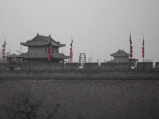 我們爬得是東長樂門,由於城牆很厚,所以陝西人有一句罵人的話就是,「你的臉皮比城牆還厚」。另外現在西安人民政府還規定牆內的大樓不可以高過城牆的高度,所以我們也發現西安的大樓都在牆外,牆內的樓房都比較低矮。導遊告訴我們,如果把唐朝的城牆修復起來的話,面積會是現在明城牆的五倍以上,總共達到84平方公里,由此可知唐朝國力的雄厚。
